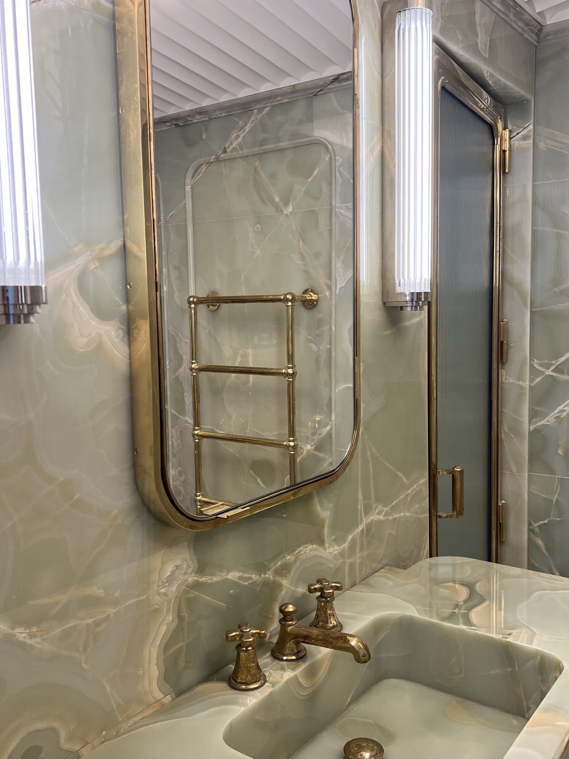 It took us months to source the right block. The delicate hue and the translucency of the pale green onyx make the final result breathtaking. The walls have been designed with a profile with round corners that add softness to the room.