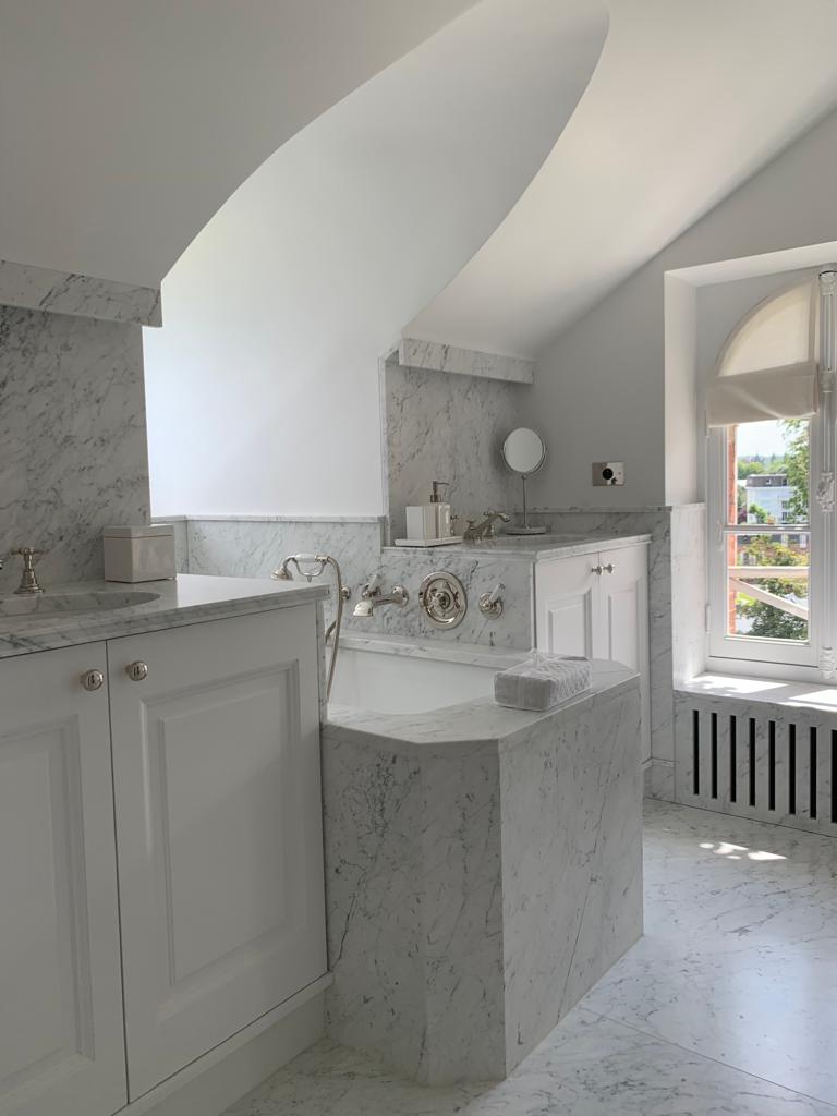 The Bianco Venatino marble with the honed finish was chosen for the 6 en-suite bathroom in the house.