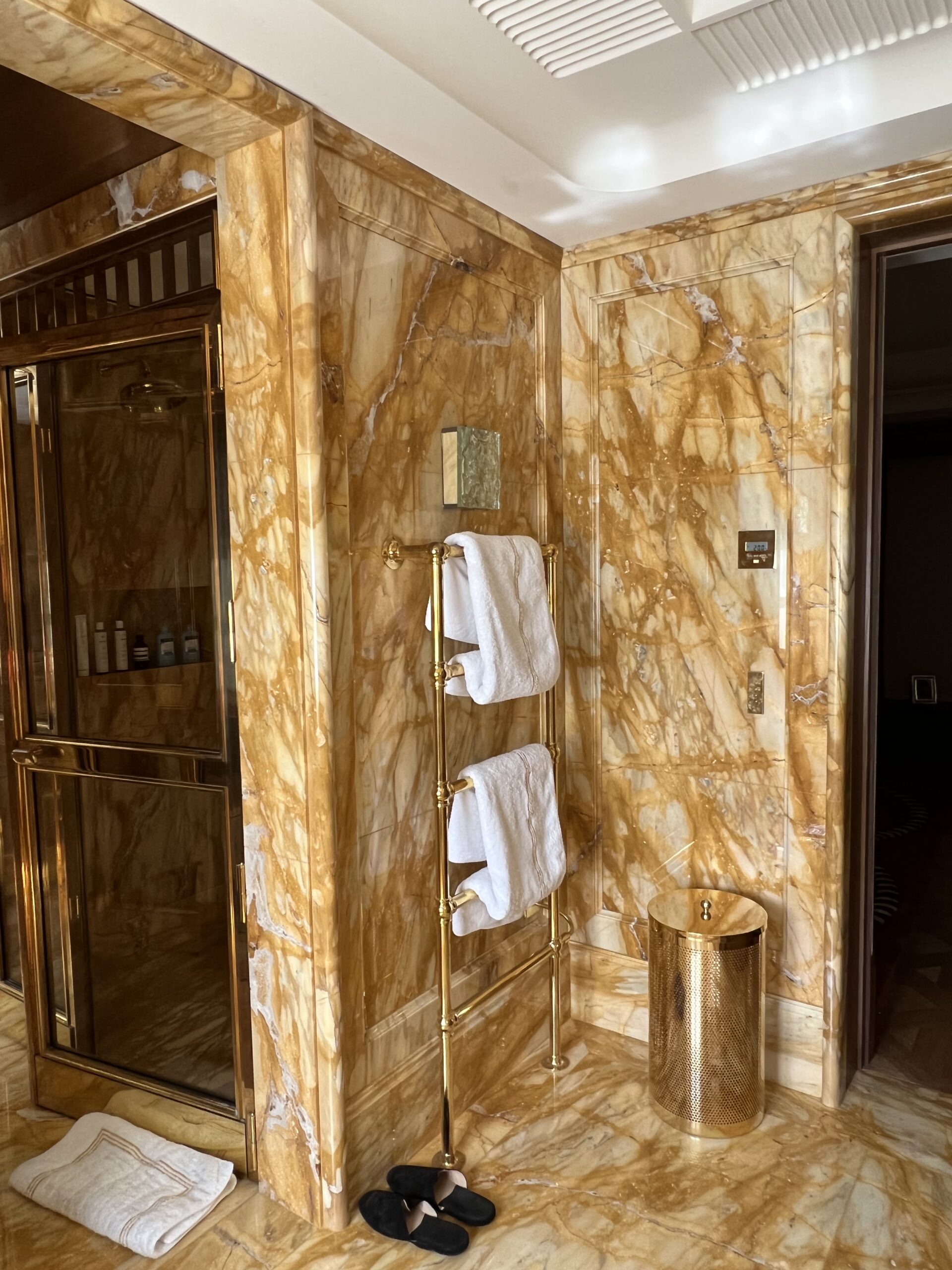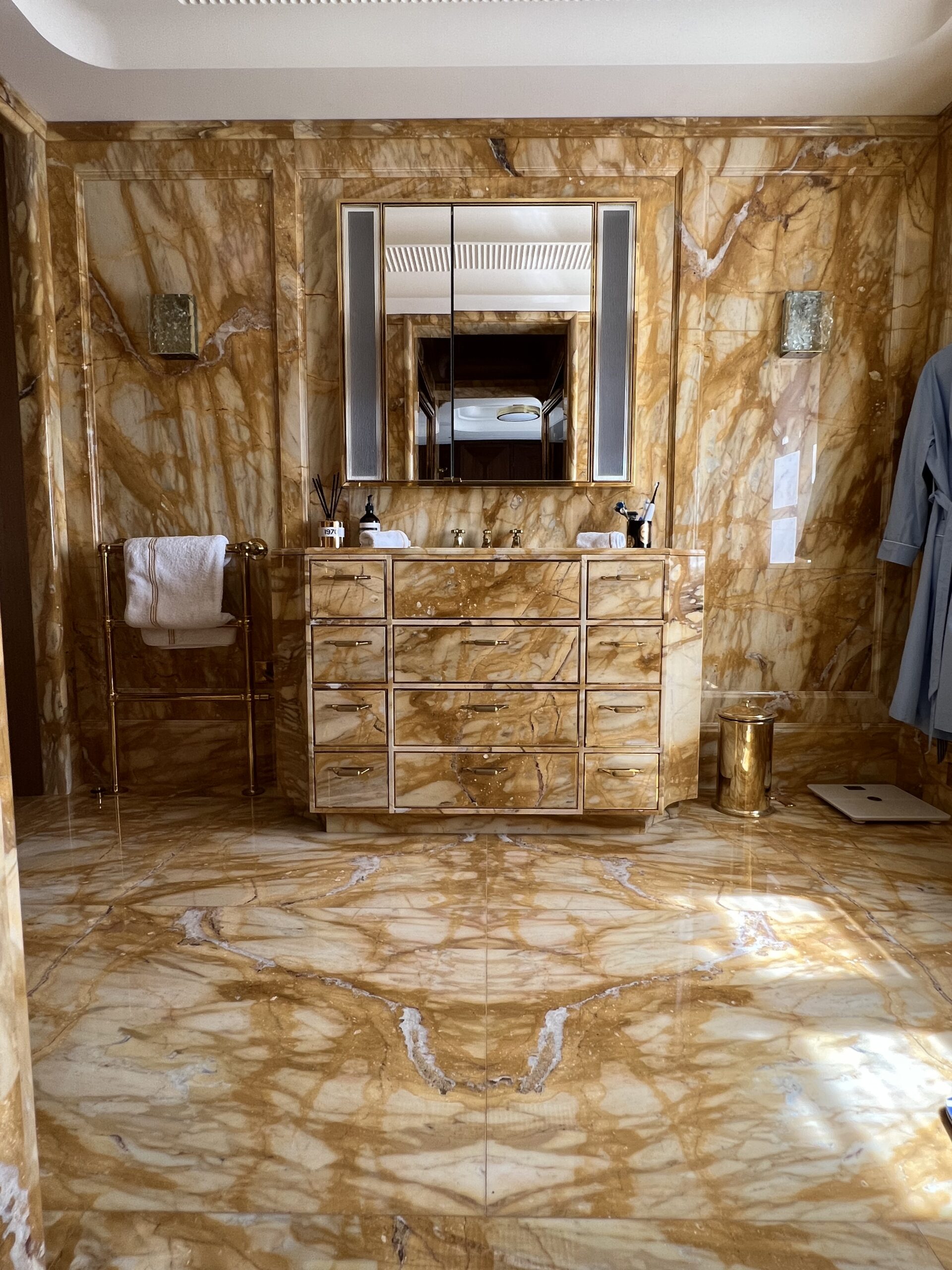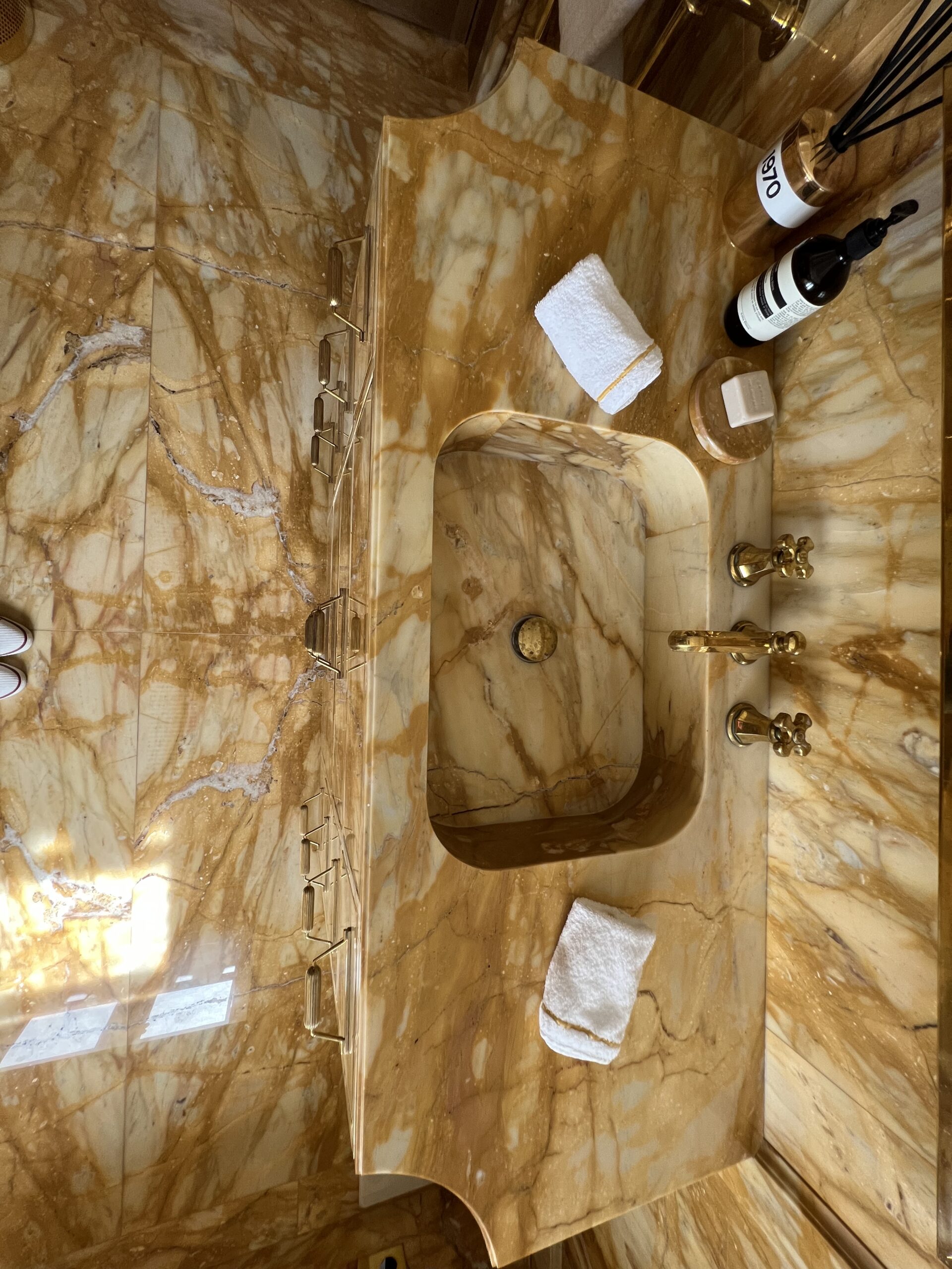 The Giallo Siena is the epitome of the classic marble. It has always been used in Italy in many city palaces and in country side mansions. In this project, the wall panels are framed like pictures, the frames giving an elegant and timeless vibe to the room. The floor and walls have been cut bookmatched.